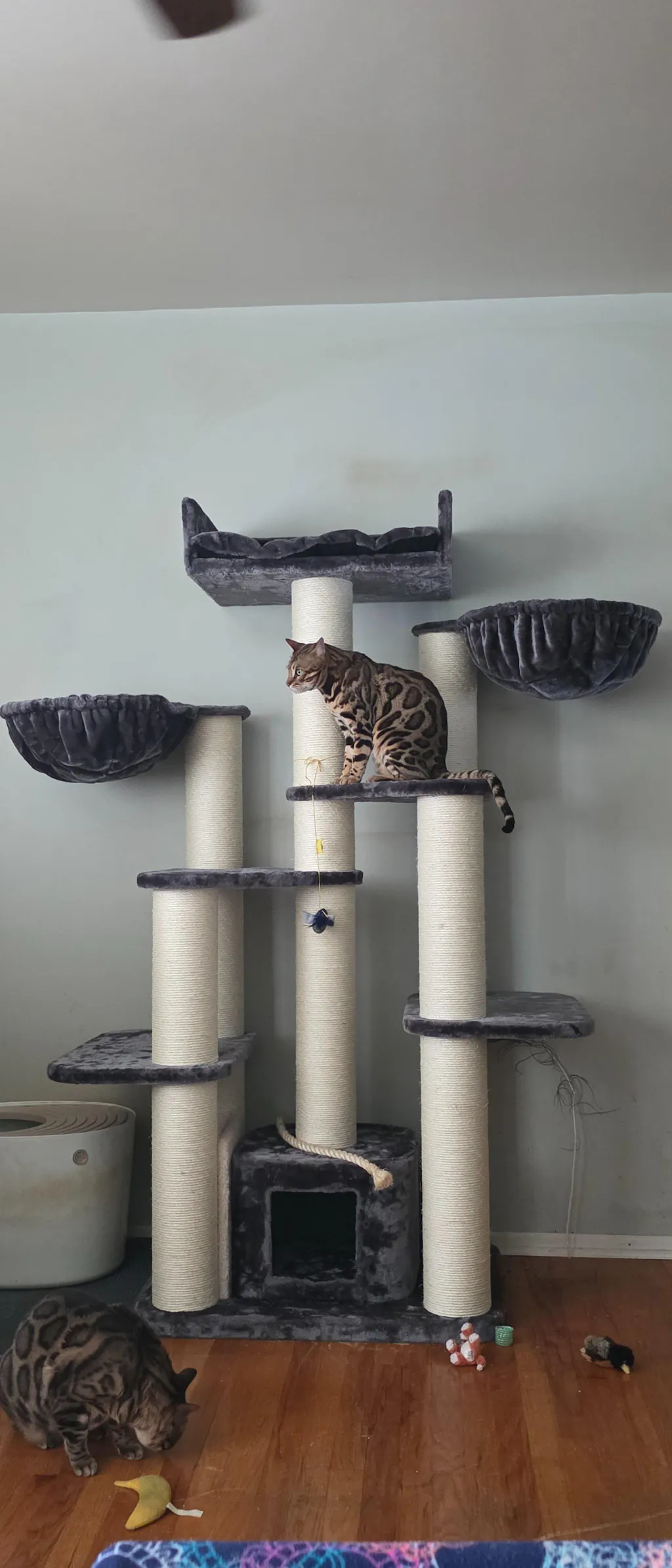 We love this tree! I rescued Gaston in April. This was my first experience with a bengal. While they can be leash trained, I did not want to expose him to the chemicals required to keep fleas and ticks off of him. Bengals are also notorious for hijinks if you don't keep them stimulated. The Cat Empire is the answer. Gaston loves it! It's huge and sturdy. He loves to pounce up and use both his front and back claws to reach the top. Since the ample scratching posts are like tree trunks, the cat empire doesn't even shake when he's scaling it. To the Cat Tree King people, let me know if you want video. On the set up and quality, it arrived in three boxes not even a week after I ordered it. I put it together within a few hours completely by myself, save the frequent inspections by Gaston. I chose this brand because all platforms are covered on all sides, so there are no ugly undersides. The nicest surprise is the robustnest of the scratching columns. BRAVO! I'm saving up for another one.