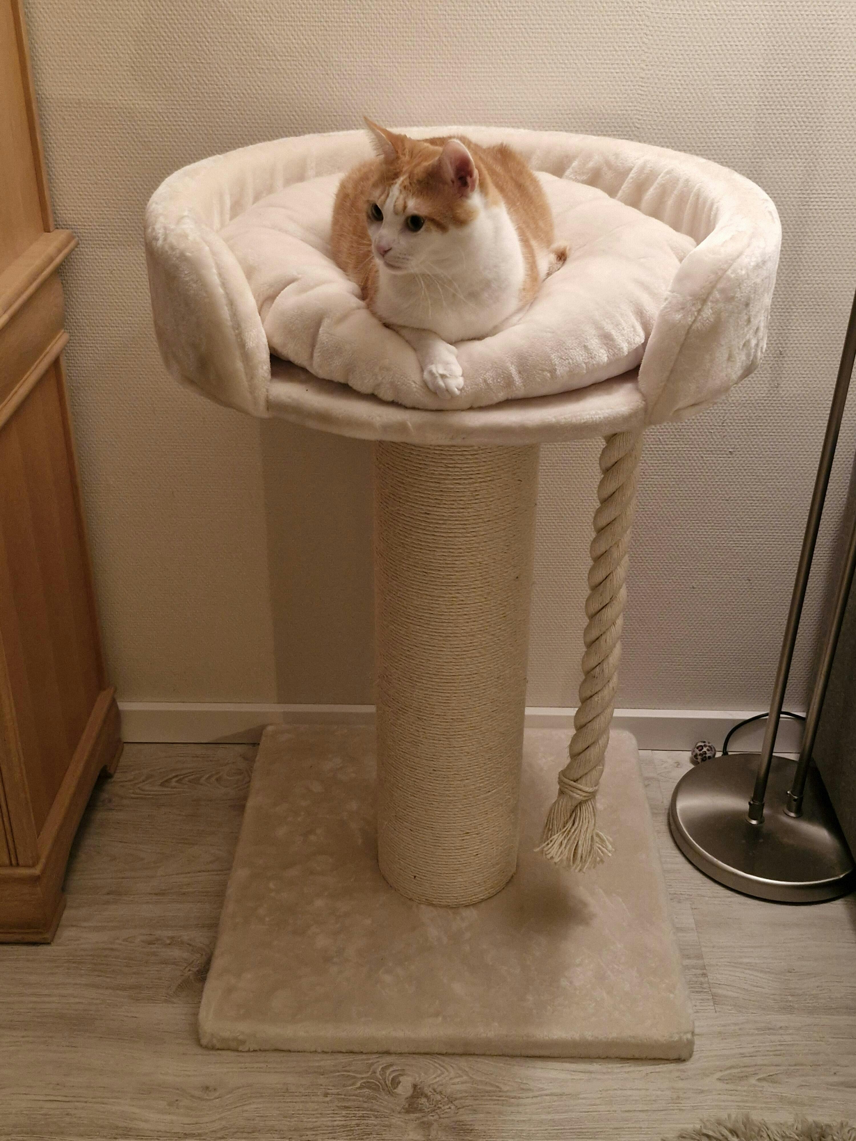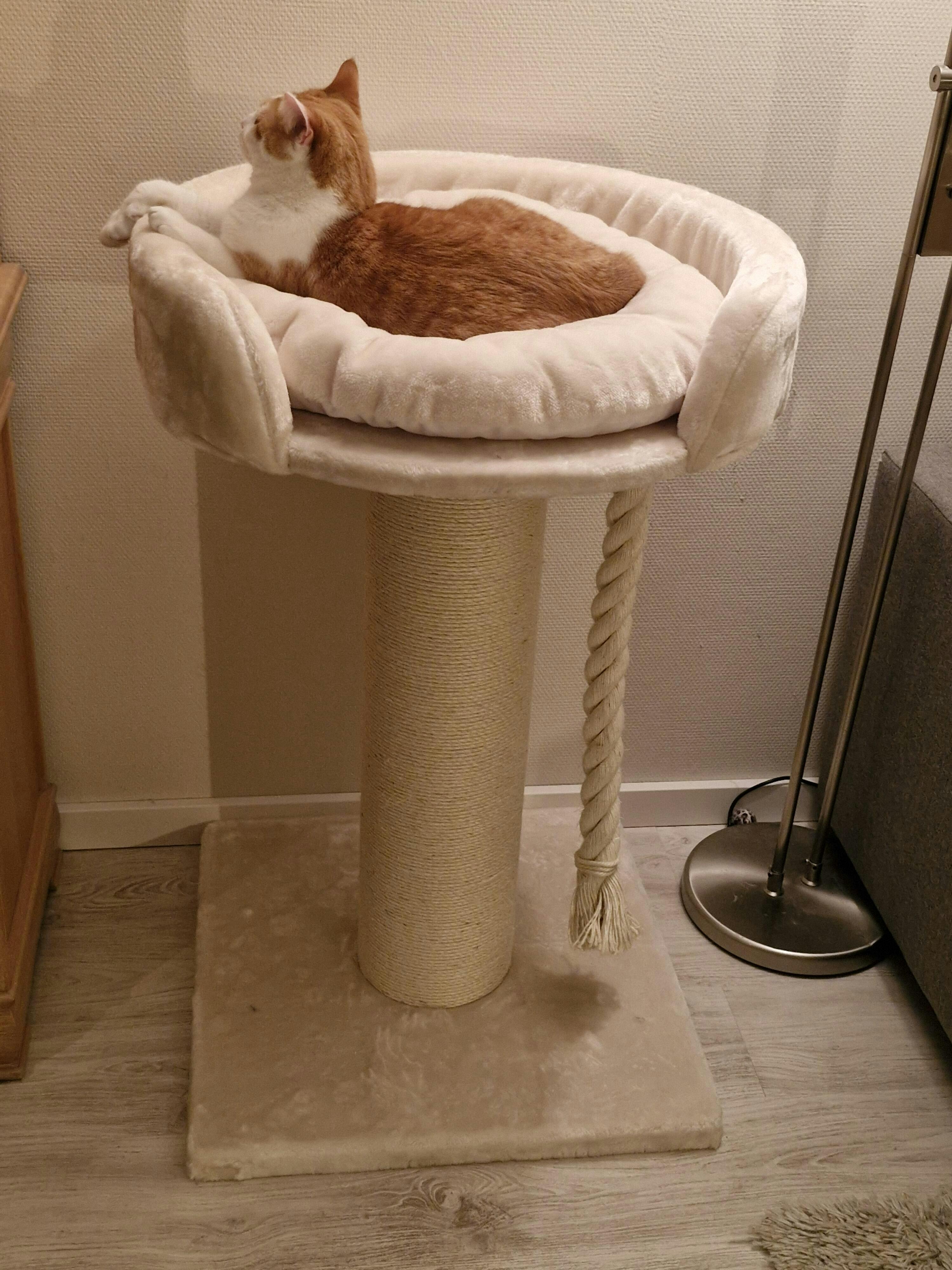 Arbre à chat de très bonne qualité. Le montage est d'une simplicité et les coloris fidèles aux images . Arbre acheté pour 3 chats ( bengal ,oriental et sphinx) et chacun d'eux y trouve son compte avec les couchages sur plusieurs hauteurs .
