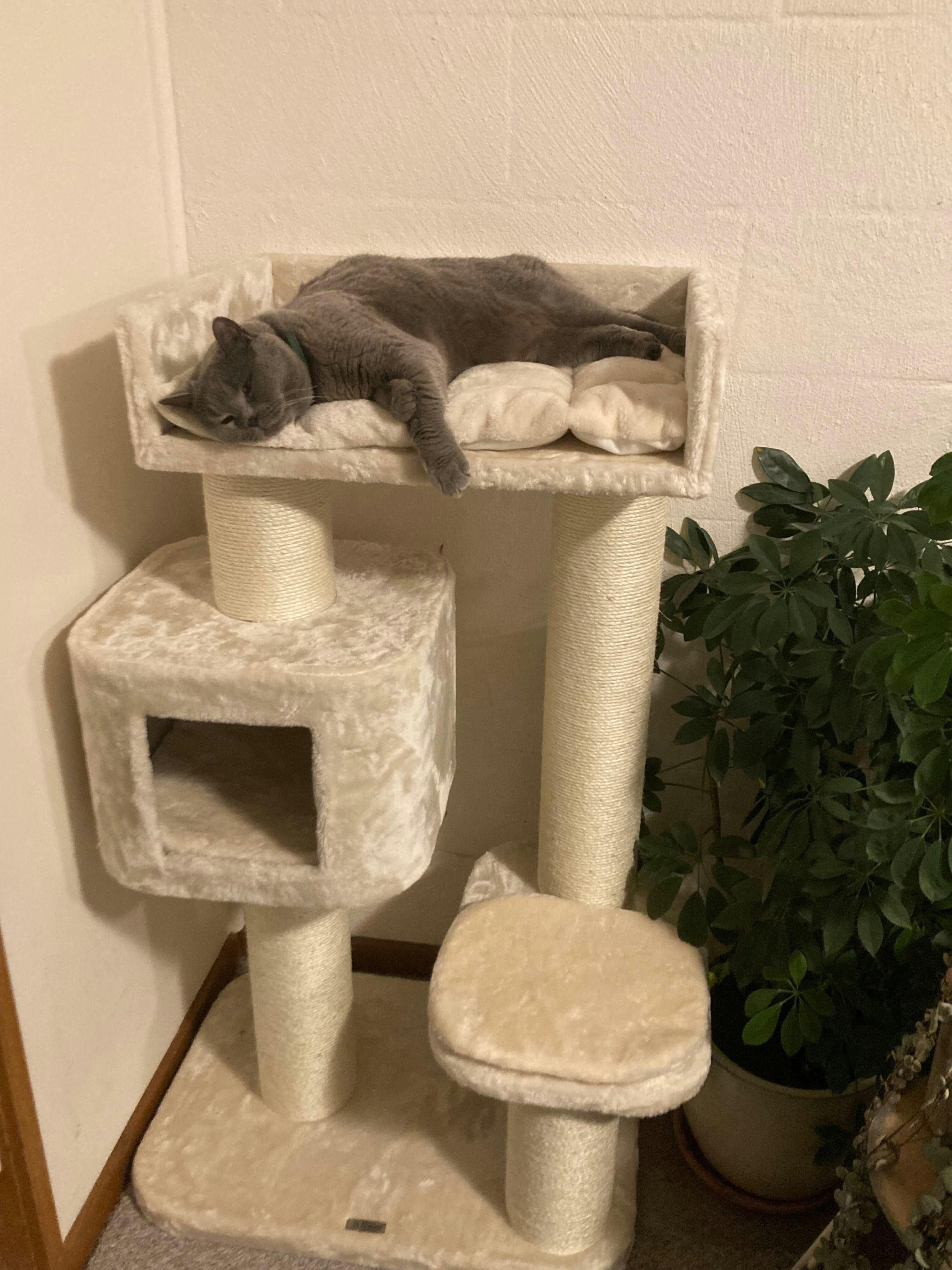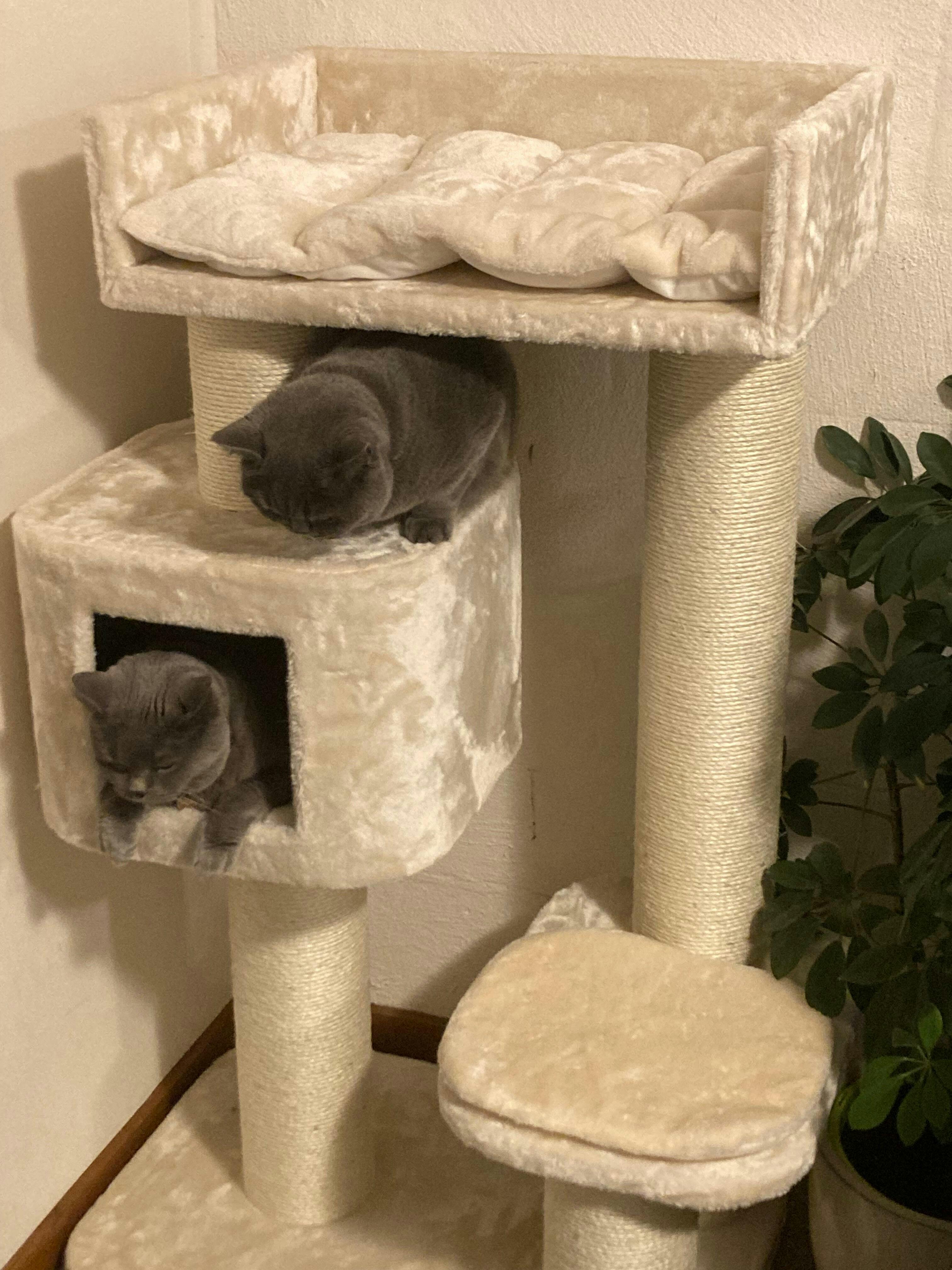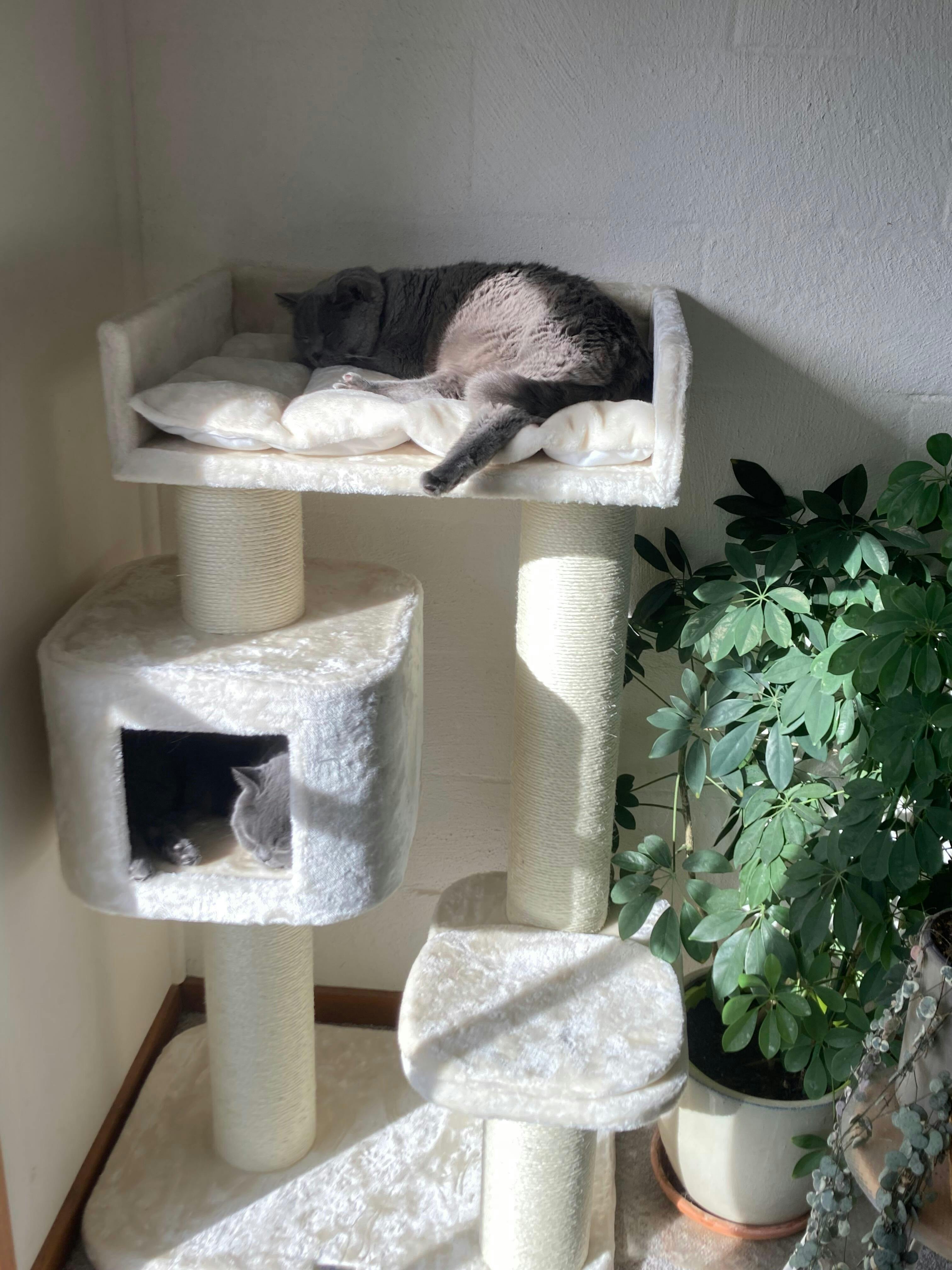 Mooie krabpaal, superstevige palen en grote ligplaatsen. Heerlijk zachte stof en kussens. Alleen de opstap naar bovenste ligplaats was voor onze katten lastig en eraf helemaal niet te doen. Dus contact gehad en direct tips en advies. We hebben het nu met extra plank opgelost. Er wordt veel gebruik van gemaakt. Grote ligplaatsen ook voor twee katten samen.