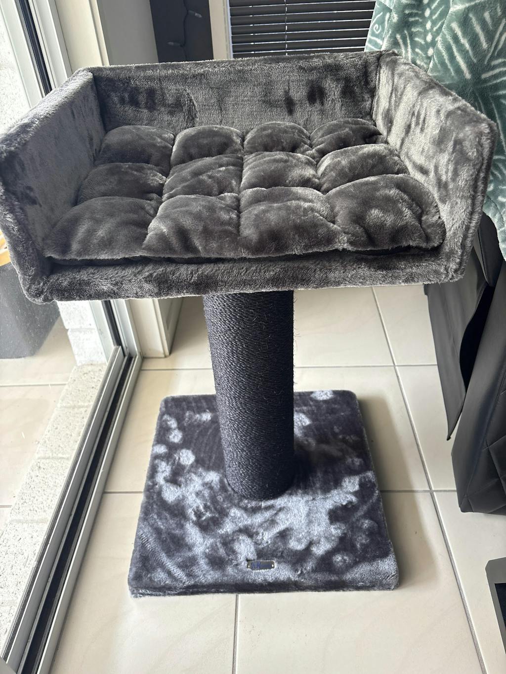 This compact, stable and stylish cat tree has a large lounge lying area of approx. 20 inch wide, by 16 inch deep and is therefore big enough for your cats. Because of the 6.3 inch high raised edge and the approx. 2 inch thick cushion, your cat will love lying in this seat.