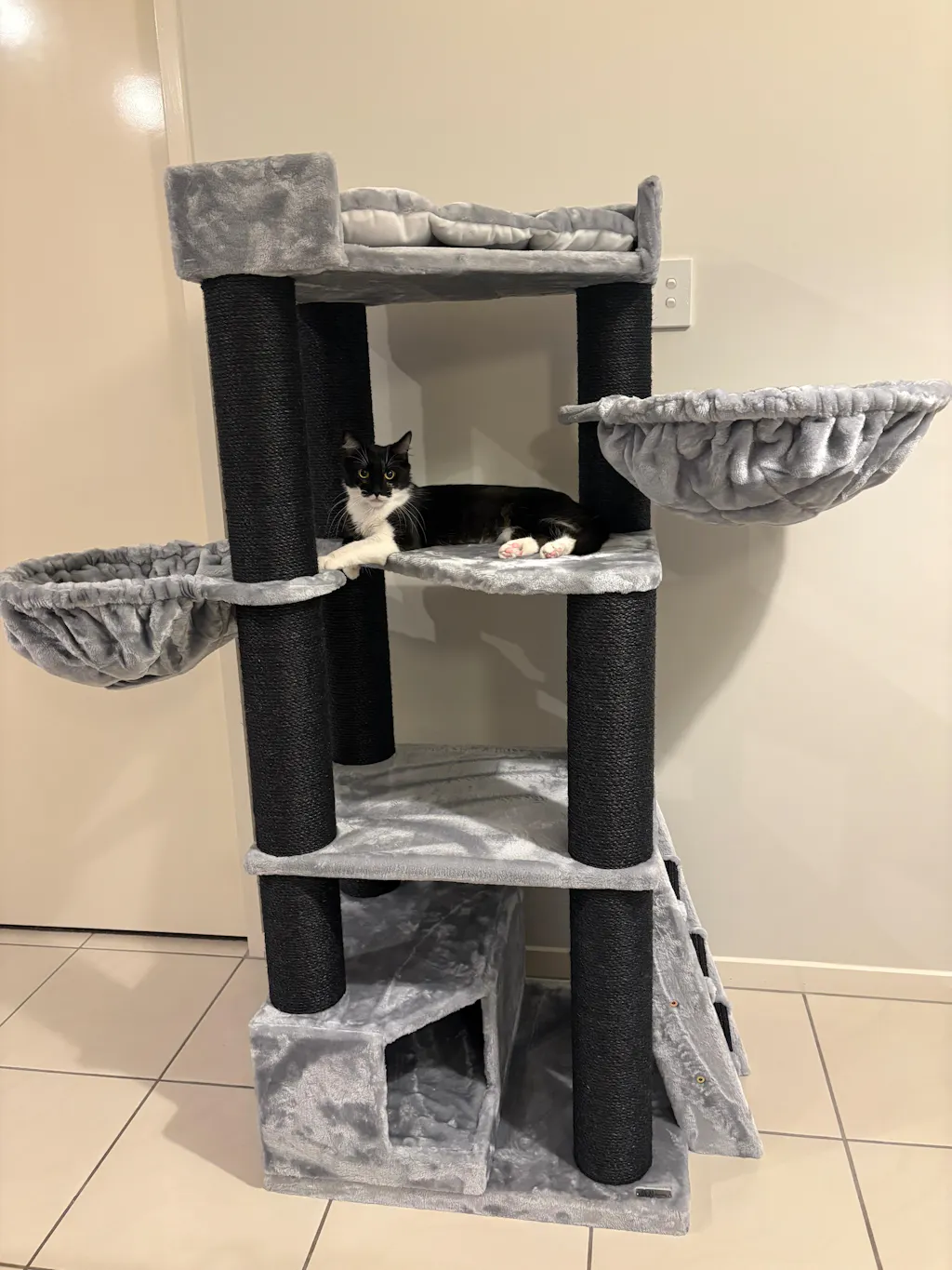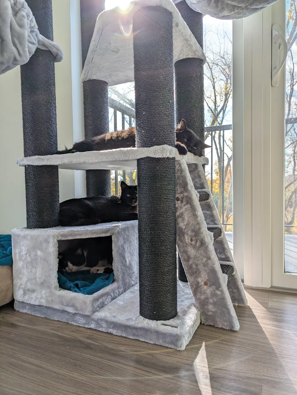 Here's a pic of my 17lb boy on the first platform, my 10lb girl on top of the cubby, and my 7lb girl inside the cubby (before I purchased another tree to help with their climbing).
