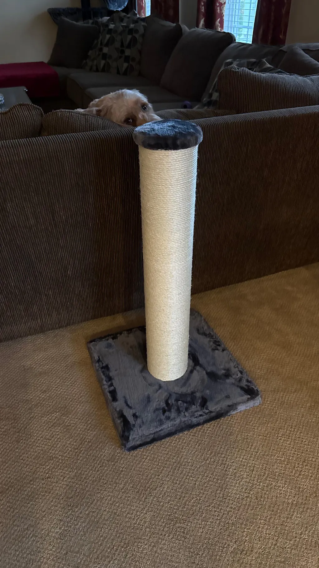 All we needed was simple post scratcher. Simple right? I ordered one from Amazon. Larger sized post (4") than the others and decent ratings. It arrived and I was shocked how small the box was. This 32" post and base came in5 pieces. The base was decently sized but was split in half and then you screw it together with these two metal brackets. The post was two pieces and the staples used to hold the sisal were haphazardly placed and had to be hammered in. When assembled it was a wobbly mess. There was no way I was going to let our three Maine Coons use this thing.